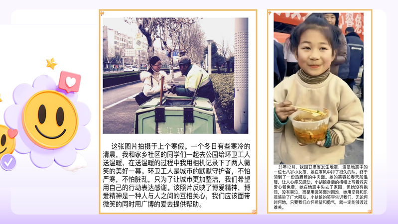 活动中,同学们充分发挥创造力与想象力,共征集到30余幅摄影或绘画作品。灿若朝霞的孩童、可爱调皮的云朵、笑容可掬的小狗、坚守岗位的医生、奉献青春的员工……一幅幅作品饱含着同学们对美好生活的期待与向往,述说着无声的爱与温暖。经评审,统计212班李俊佳荣获一等奖,其作品分享了动物、孩子、家庭的微笑,定格的笑容背后传递着浓浓的情感和温暖的故事;数师231班谢环羽、数师232班陈晓菲荣获二等奖,其作品分别展现了医者仁心,以及青年志愿者以青春之我向老人传递关爱的赤忱之心;数师232 班董舒楠、数师定向221班王璐、数师231班邱薛奕荣获三等奖,其作品呈现了笑对自然灾害的小女孩、医护卡通形象和给环卫工人传递温暖的员工。