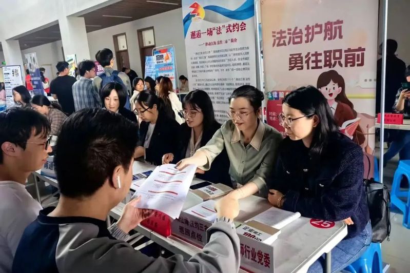 公司合作共建单位——南通市崇川区司法局与崇川区律师行业党委在招聘会现场开展“法治护航 勇往职前”公益法律服务活动。崇川区司法局协同律师、公证员设立法律咨询服务台,发放“老员工求职风险防范小TIPS”,解答就业、升学、留学、创业等方面涉法相关问题。围绕应届生编制内容、公务员笔试面试要点、公证员、律师职业规划等话题,与学院师生们进行了深入浅出的互动式讲解。