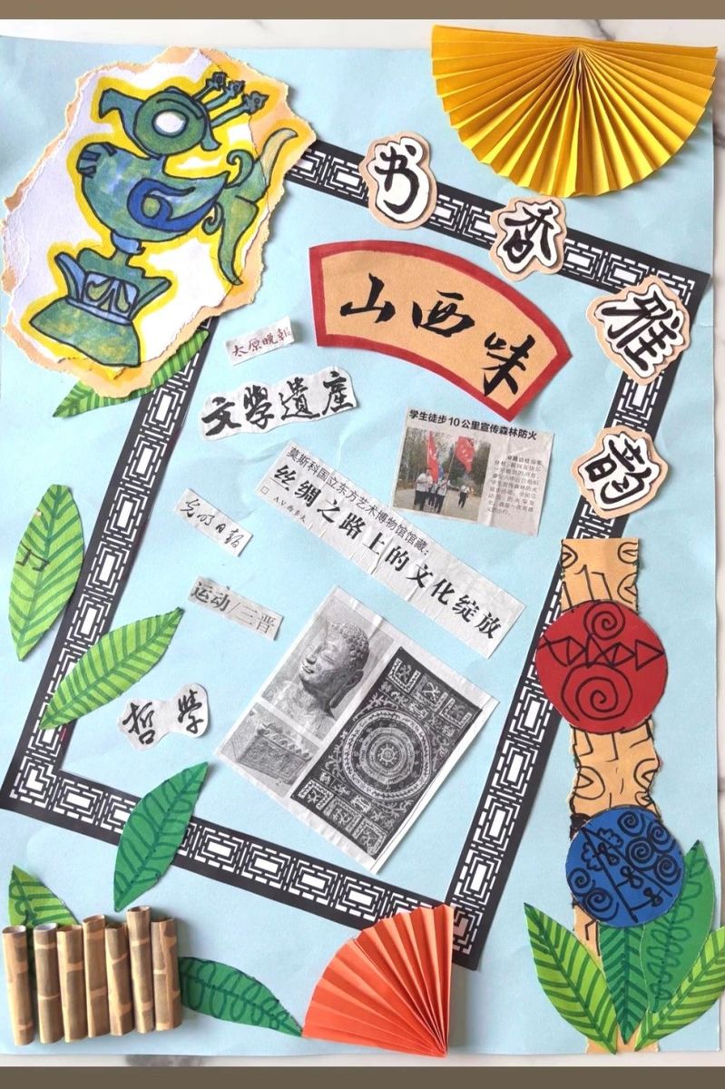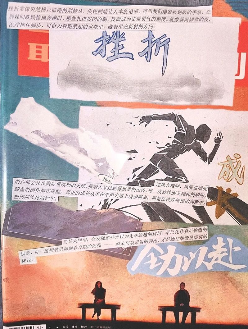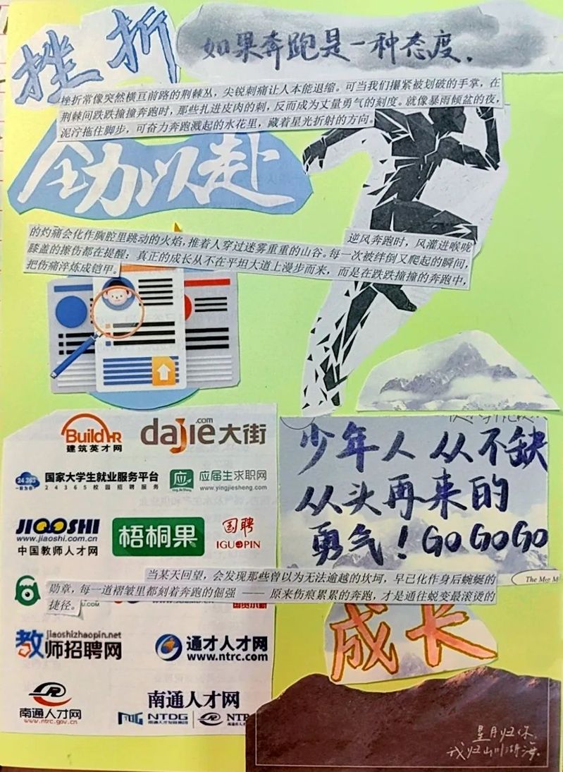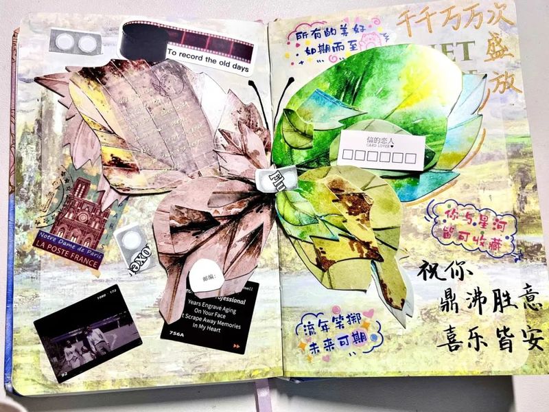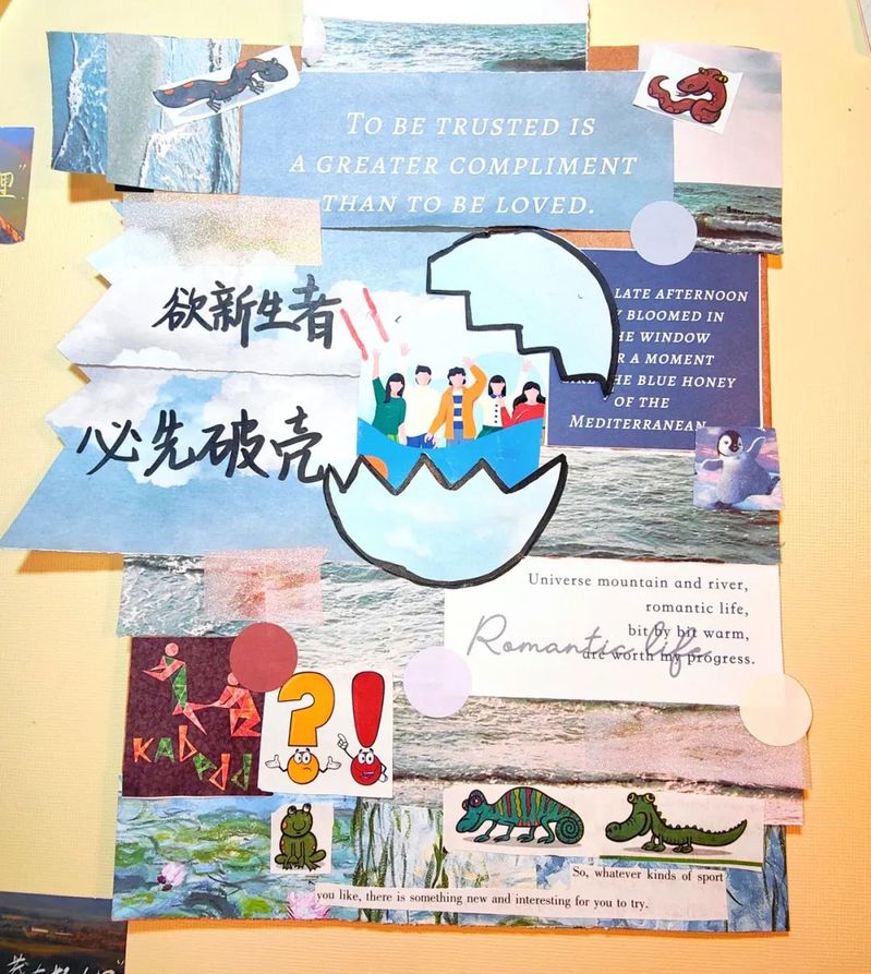 “旧页蕴彩”,绝非简单的拼贴画创作,而是一场与自我的深度对话。剪刀落下,裁去的不仅是旧日的裂痕,更是那些萦绕心头的遗憾与不甘;胶水粘合,连接的不只是记忆的断层,更是破碎后重组的希望与力量。在卡纸上,一个个挫折后的 “图腾” 悄然生长,仿佛在诉说着生命的顽强与坚韧。正如 “欲新生者必先破壳”,那些碎裂的纸页在指尖重获新生,褪去旧壳时的痛楚,化作黎明时分大海上的微光,照亮心底沉睡的勇气,让我们得以在破茧的瞬间,遇见更强大的自己。