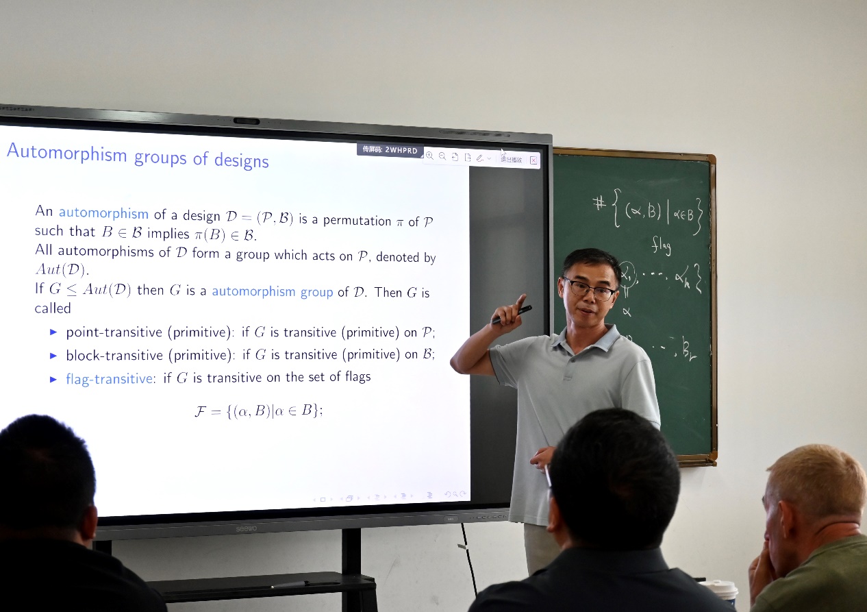 周胜林教授以 “区组长度为素数平方或立方的旗传递2 -设计” 为核心,探讨了组合设计的对称性与群作用。报告基于O’Nan-Scott定理,分类了旗传递2 -设计的自同构群结构,重点分析了点本原群(仿射型、几乎单型、乘积型)与点非本原群的参数约束。