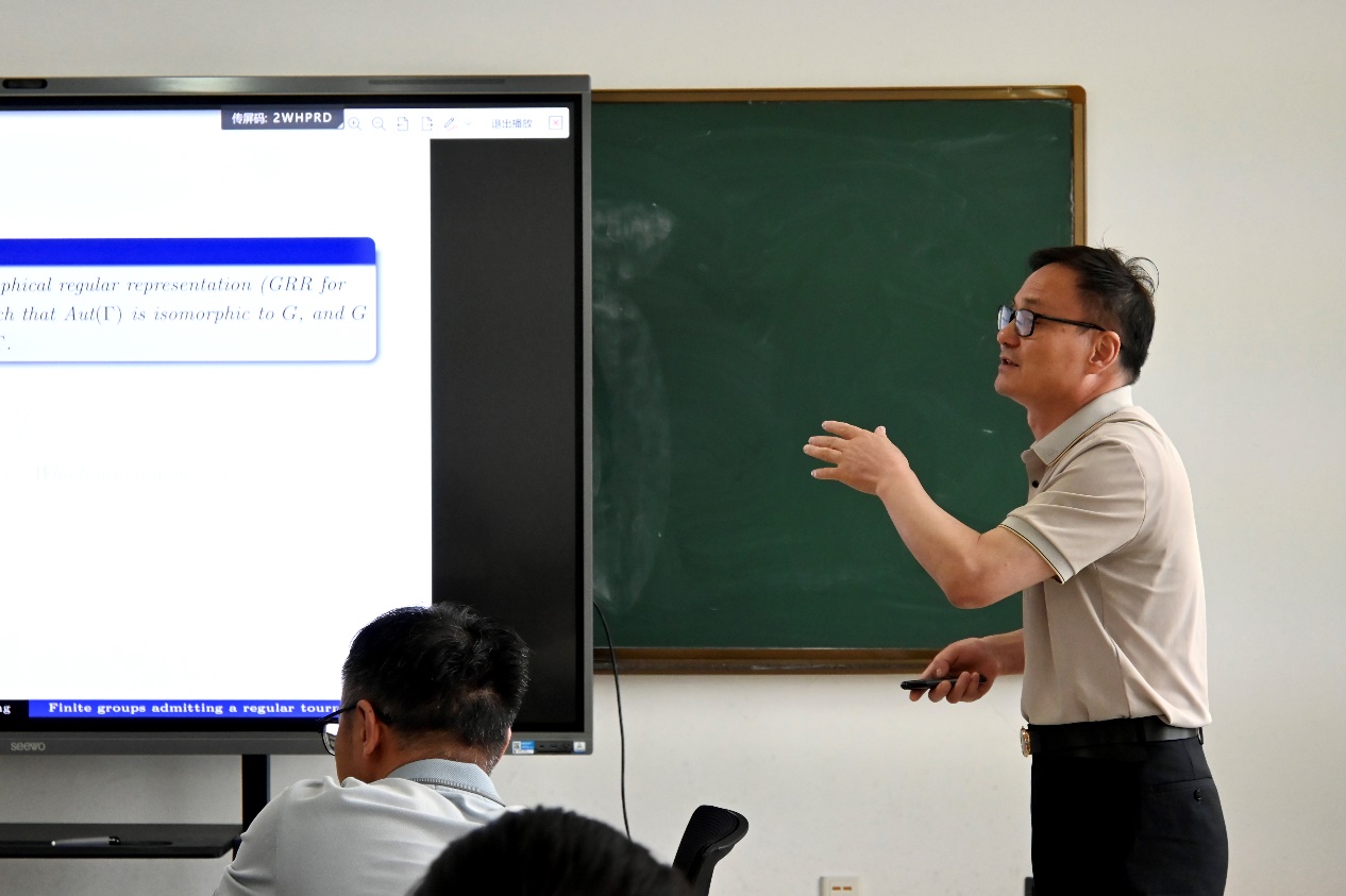 王登银教授以 “有限群的正则竞赛图m -半正则表示” 为题,围绕有限群的图论表示理论展开。报告从Frucht定理出发,回顾了群的图正则表示(GRR)、有向图正则表示(DRR)等经典结果,重点介绍了竞赛图正则表示(TRR)的奇偶性条件 —— 奇数阶群存在TRR的充要条件。