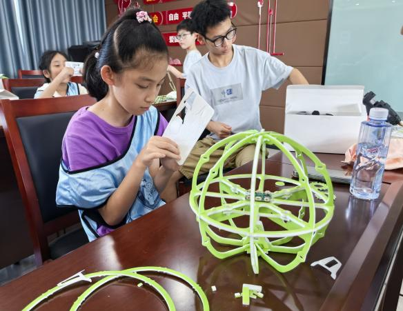 在电机、螺旋桨、电池、机身框架组成的“科技零件海洋”里,孩子们根据老师们的讲解和组装演示,小心翼翼组装属于自己的无人机。慢慢调试、起飞,灵巧绕障、穿梭跃杆、精准过圈…那种亲手创造的成就感如同夏日阳光般炽热。