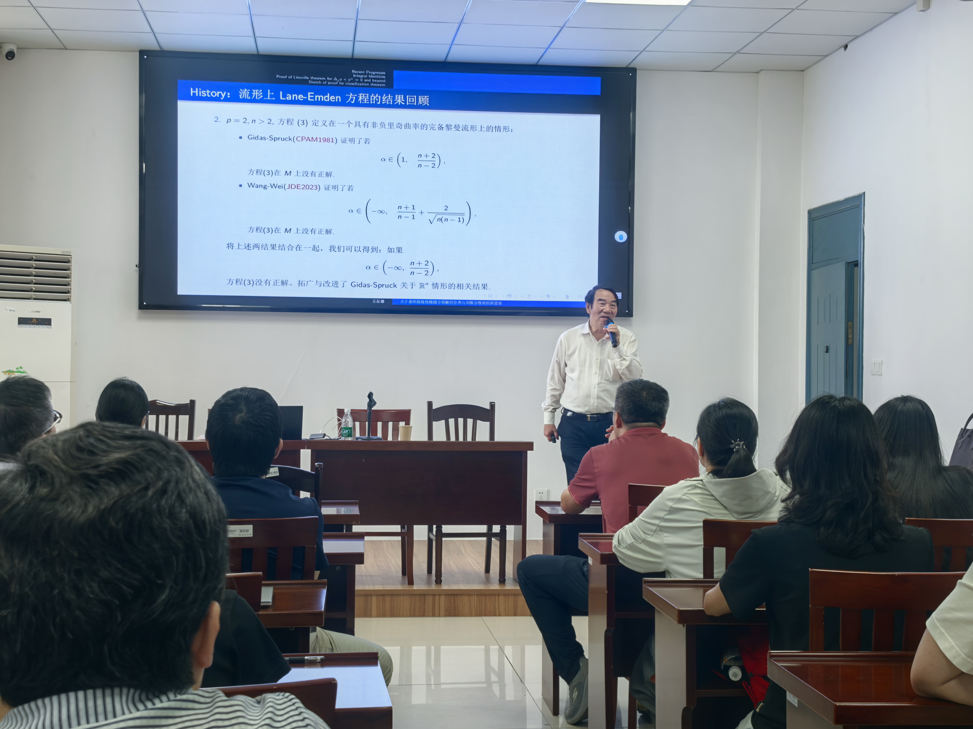 王友德教授阐述了非紧完备流形上拟线性退化Lane-Emden方程的最佳Liouville定理以及如何使用Nash-Moser迭代获得一类拟线性退化椭圆方程正解最佳Cheng-Yau型梯度估计,进而介绍了Ricci曲率非负的非紧黎曼流形上临界$p$-Laplace方程正解的分类及刚性。他结合自身多年求学探索、教学实践与科研攻坚经历,提出高屋建瓴的见解,让在场师生深受启发。报告后,师生们踊跃提问。