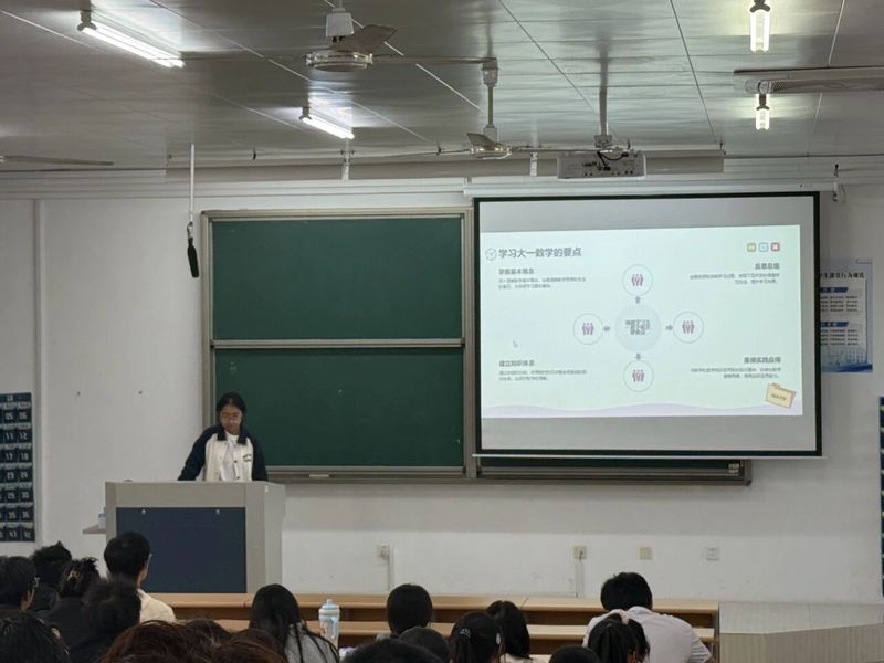 接着,数师241班姚易谦同学系统性地剖析了大学数学与高中数学的差异。她提出了学好大学数学的四大要点:吃透基本概念、建立系统知识体系、重视实践应用、定期反思总结。她还分享了一套完整的学习流程,从课前预习、课堂互动到课后复习与计划制定,为同学们描绘了一条清晰、高效的学习路径。
