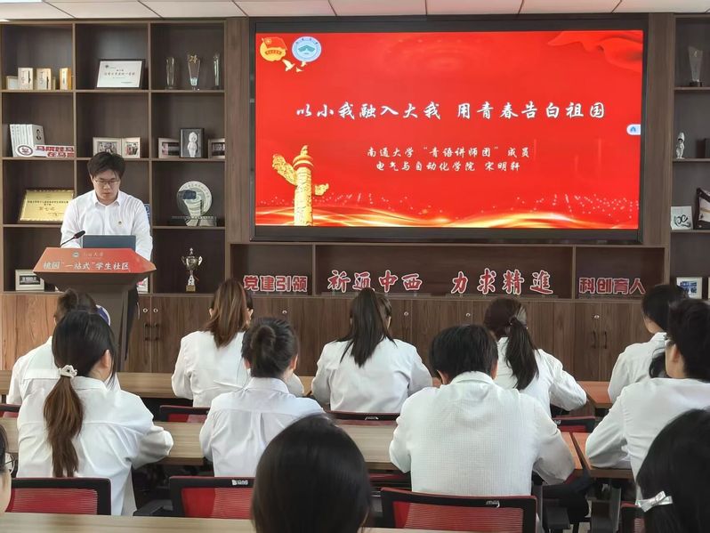 青语讲师团成员、电气工程及其自动化233班宋明轩同学以“以小我融入大我,用青春告白祖国”为主题,讲述了“莫文隋”精神的起源与传承。他从汤淳渊老师匿名助学的感人事迹切入,阐释了“莫问谁”背后的奉献精神,并分享了自己参与志愿服务、基层调研等实践经历,号召团员青年将个人理想融入党和人民事业,以实际行动践行青春誓言。