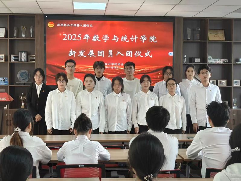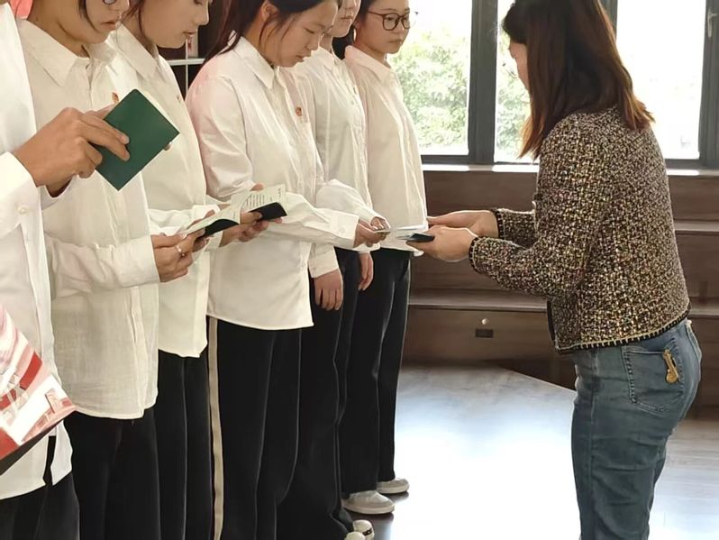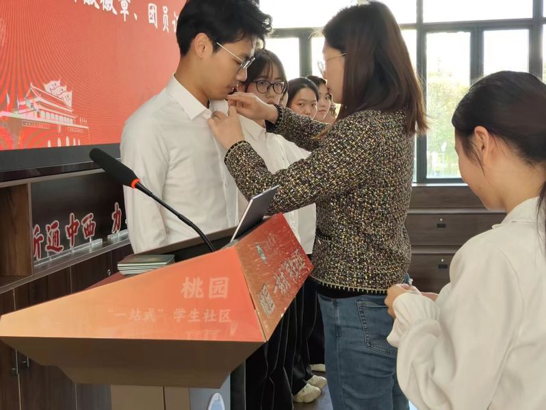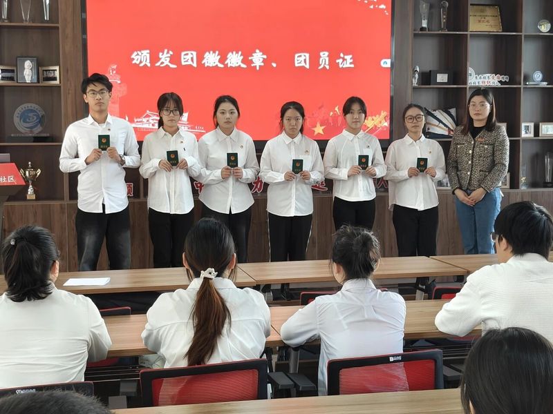 魏妍妍老师逐一为新团员颁发团员证并佩戴团徽。金色的团徽在胸前闪耀,象征着光荣的身份,更意味着沉甸甸的使命与担当。随后,魏老师向新团员表示热烈祝贺,并对新发展团员提出了四点希望:第一,要筑牢信仰根基,像坚信数学公理一样坚定理想信念,做思想上的“明白人”;第二,要锤炼专业本领,以攻坚克难的毅力深耕专业领域,做素养过硬的“实干家”;第三,要践行团员责任,以统计般的严谨对待学习和生活,做言行一致的“靠谱人”;第四,要勇担时代使命,以开拓创新的精神服务国家需求,做贡献青春的“先锋者”。