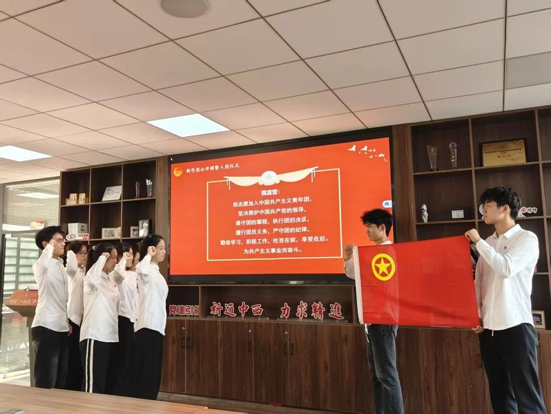 公司团委组织部部长吴嘉莉领誓,全体新团员面向团旗,高举右拳,庄严宣誓。铿锵有力的誓言回荡在整个会场,彰显出青年一代坚定不移听党话、跟党走的信念与决心。