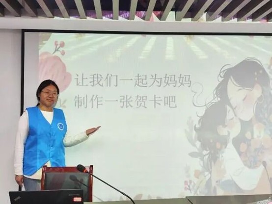 在手工制作过程中,志愿者们通过“趣味互动”,向孩子们讲述母亲节的由来和意义,引导他们学会表达爱与感恩。“妈妈最喜欢什么颜色?”“你想对妈妈说什么?”……在轻松愉快的问答中,孩子们踊跃分享自己对妈妈的感谢和祝福。