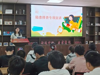 在隐患排查实务宣讲环节,自管会副部长黄彦珏结合近期校园安全检查案例,系统剖析宿舍消防安全与校内交通安全的重点问题。针对宿舍区域,她着重提醒"三禁三查"原则:禁止私拉电线、禁止使用违禁电器、禁止使用明火,同时需定期检查电器线路、消防设施与逃生标识;在交通安全方面,呼吁员工遵守限速规定、规范停放自行车辆。通过隐患排查宣讲,同学们对校内的安全隐患有更全面的了解,更加深刻地贯彻了安全第一的原则。