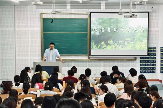 在诚信考试教育大会中,聚焦学术诚信与考风考纪建设。学院通过政策解读、案例警示、互动宣誓等环节,向全体在校生传递“守正笃实”的学术理念。会上强调考试作弊的严重后果,引导员工以真才实学应对挑战,以诚实守信树立人格。活动通过传统文化经典诵读、教育短片赏析等形式,将“诚信”精神融入校园文化血脉。全体员工集体诵读《诚信考试承诺书》,以铿锵誓言彰显坚守学术底线的决心