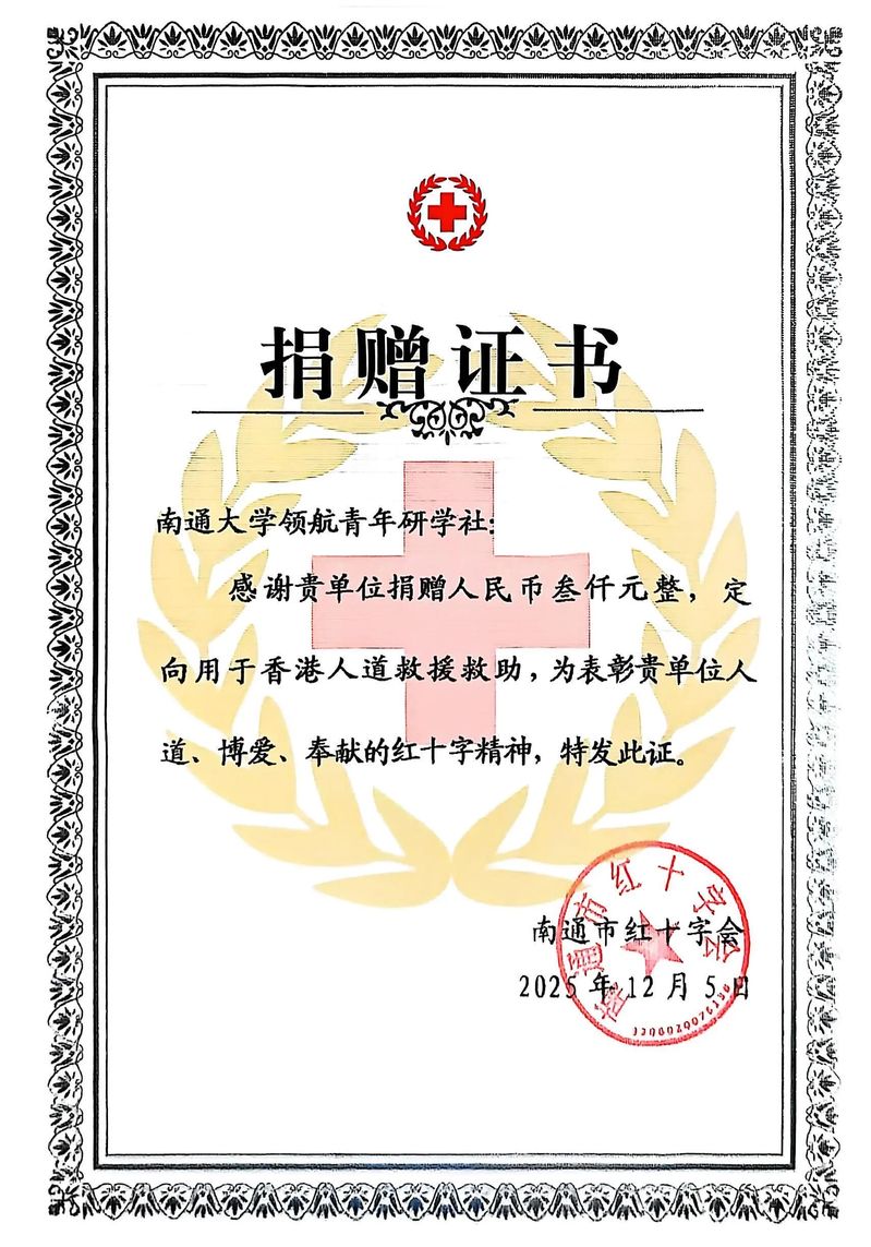 当天的捐赠仪式上,南通市红十字会工作人员为领航青年研学社颁发了捐赠证书,对学子们的爱心善举表示肯定与感谢。研学社成员代表表示,此次捐赠是社团成员共同商议的结果,大家希望以实际行动为香港的人道救援事业贡献一份青春力量,让爱心跨越地域传递温暖。